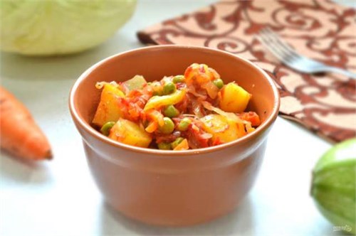 Картофель, морковь, перец болгарский, горошек зеленый, капуста белокачанная, чеснок, соус томатный, специи.